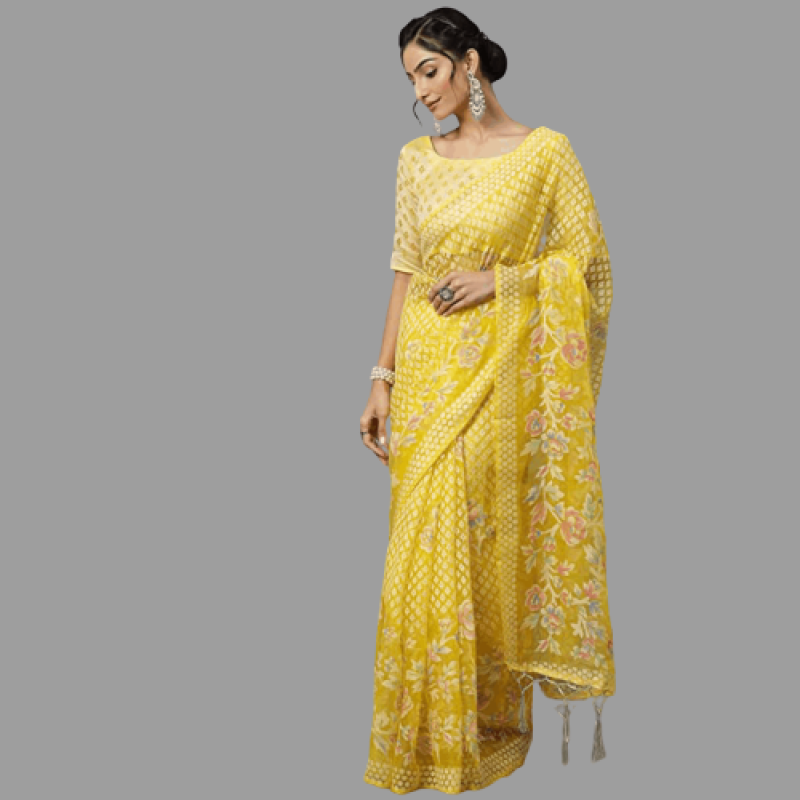 AKHILAM Women's Brasso Floral Printed Chanderi Saree with Unstitched Blouse Piece